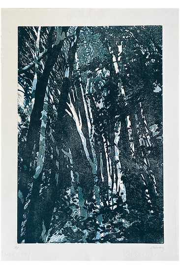 Both prints are interpretations of the same sketch. In Dappled Light the viewer is standing in the clearing looking up where as in Lichtung the viewer is looking at the scene from the outside.